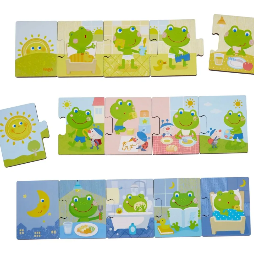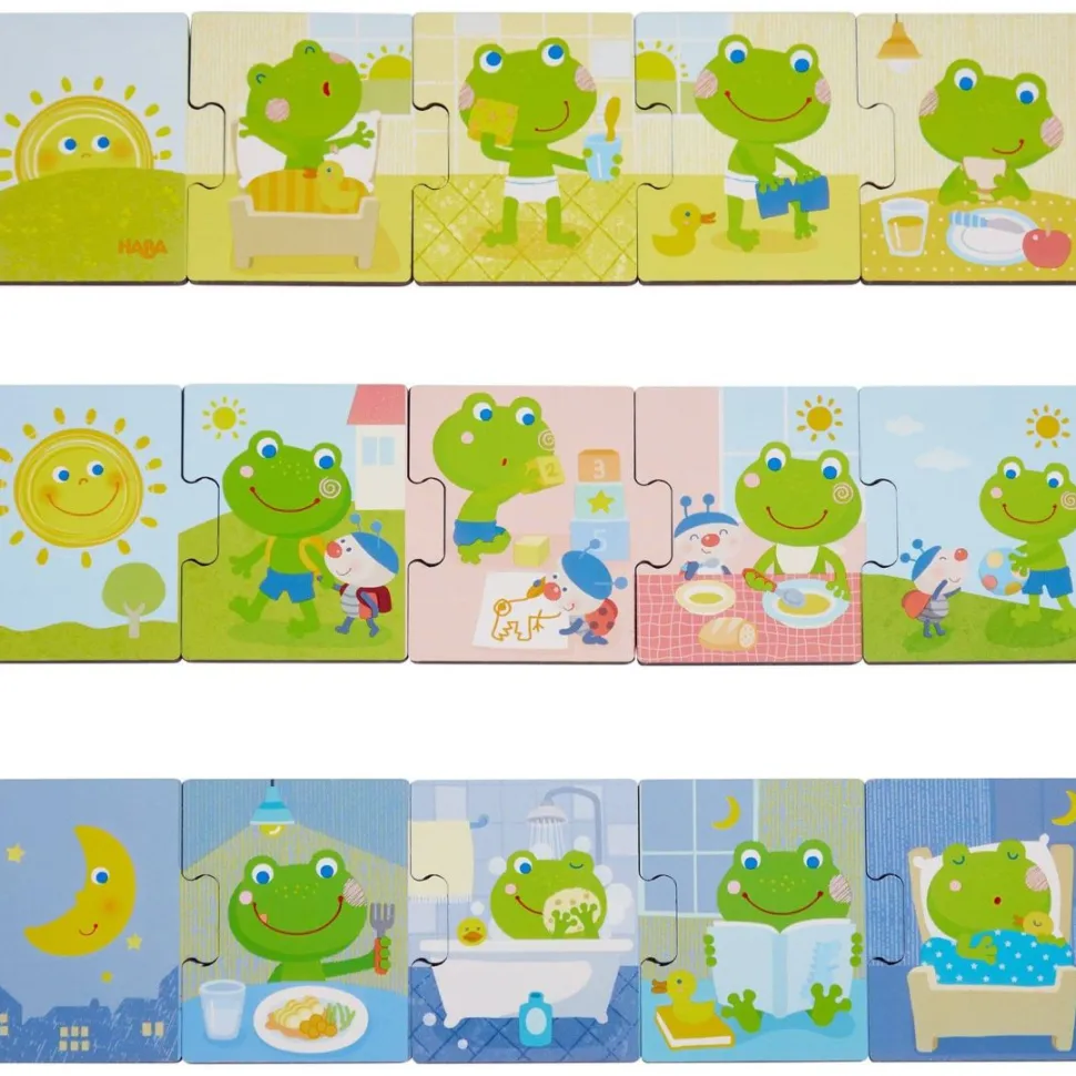 Includes 15 Pieces, 5 Pieces Coded In Yellow Represent The Morning Routine. 5 Pieces Coded In Green For The Daytime Activities And 5 Pieces Coded In Blue For Froggies Bedtime Routine.